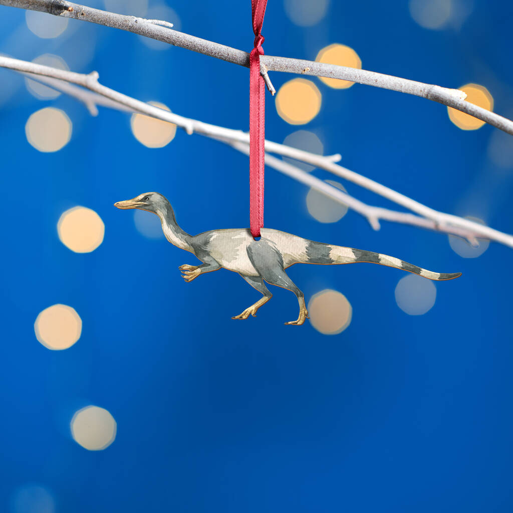 Beautifully illustrated wooden Xunmenglong Christmas decoration, printed in high-definition on plywood. Eco-friendly, educational, and made in England, perfect for dinosaur lovers of all ages.