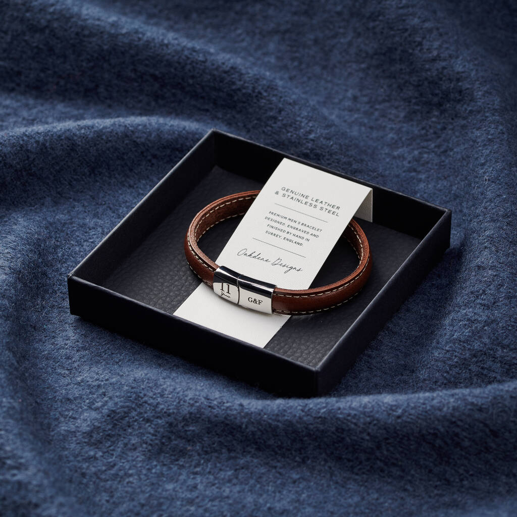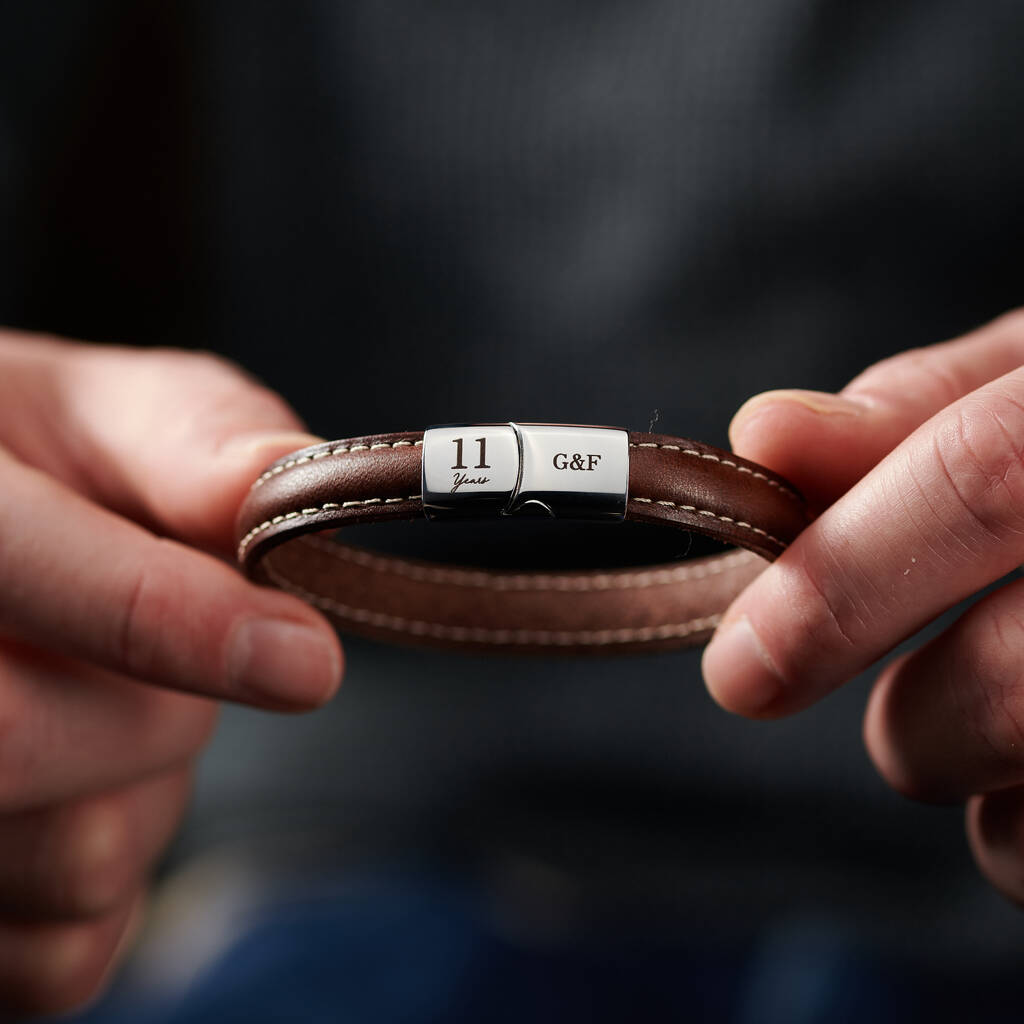 Designed to celebrate the 11-year anniversary (traditionally associated with steel) this premium men’s bracelet brings together smooth leather and a solid stainless steel clasp for a balanced, modern finish. Although inspired by eleven years together, it can be personalised for any anniversary milestone.