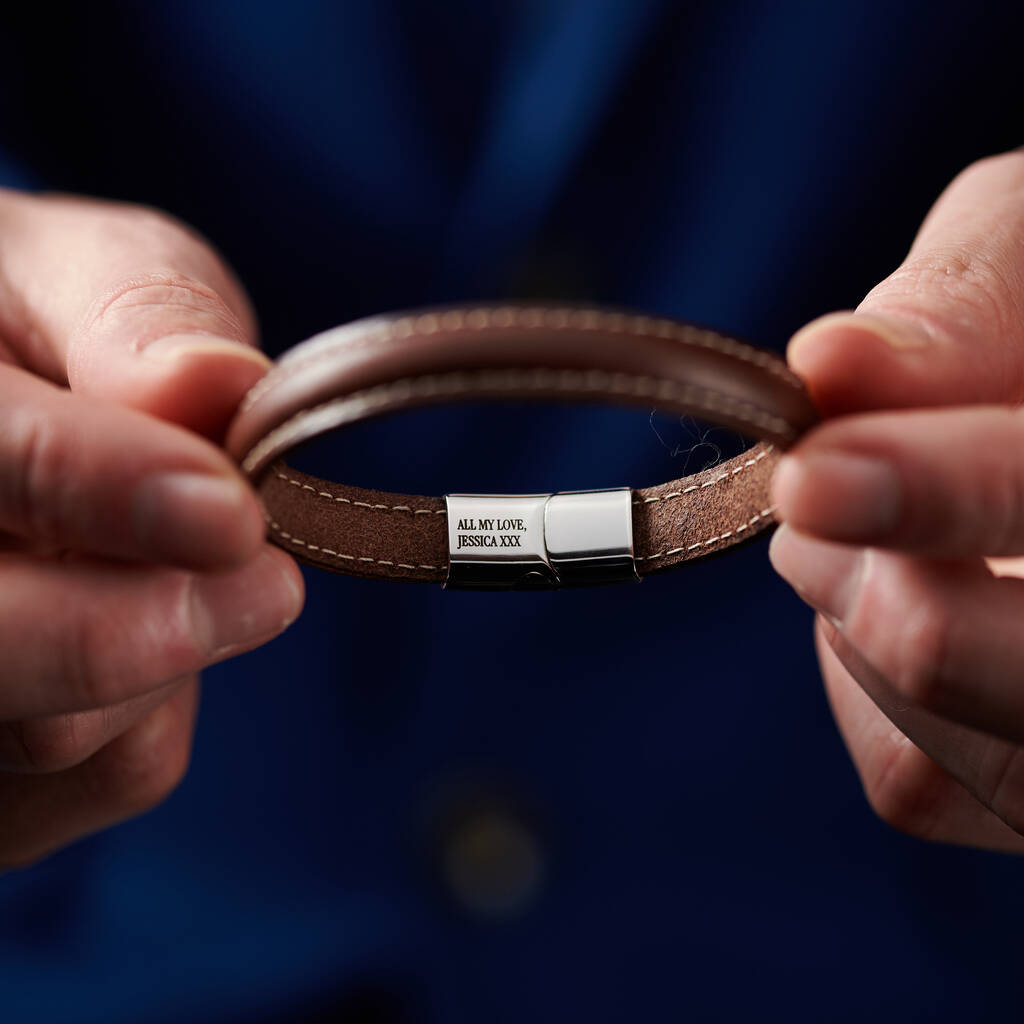 Designed and engraved by us in our Surrey workshop, each bracelet is engraved with exceptional precision and carefully hand-finished, ensuring the details are perfectly placed and beautifully crisp. The reverse of the clasp can be personalised with names, or short hidden message, a discreet detail just for him.