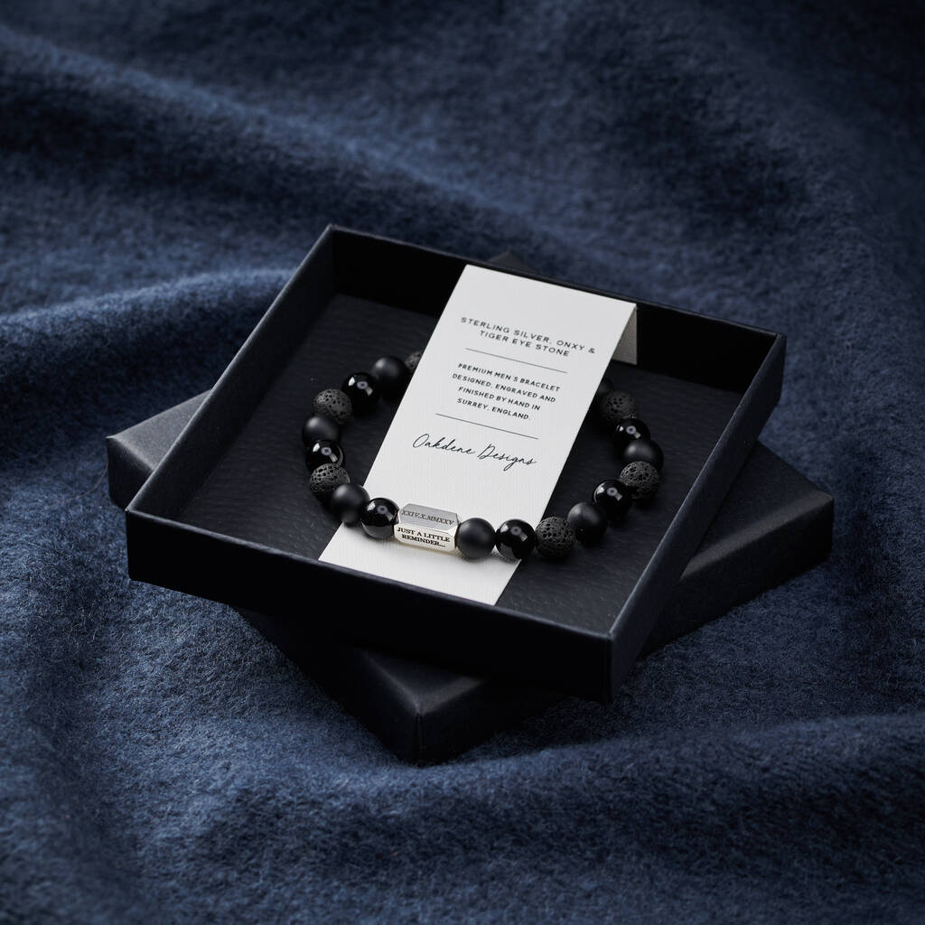 Personalised Men's Sterling Silver And Black Onyx Bead Numeral Date Bracelet