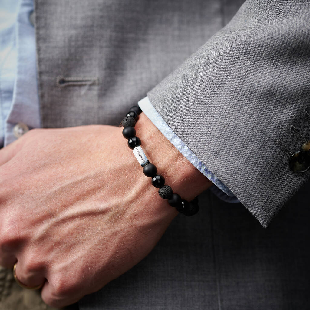 Crafted using black onyx and lava stone beads, this bracelet offers a strong, contemporary look, finished with a solid sterling silver rectangular charm. The mix of smooth and textured beads creates a balanced, tactile feel.