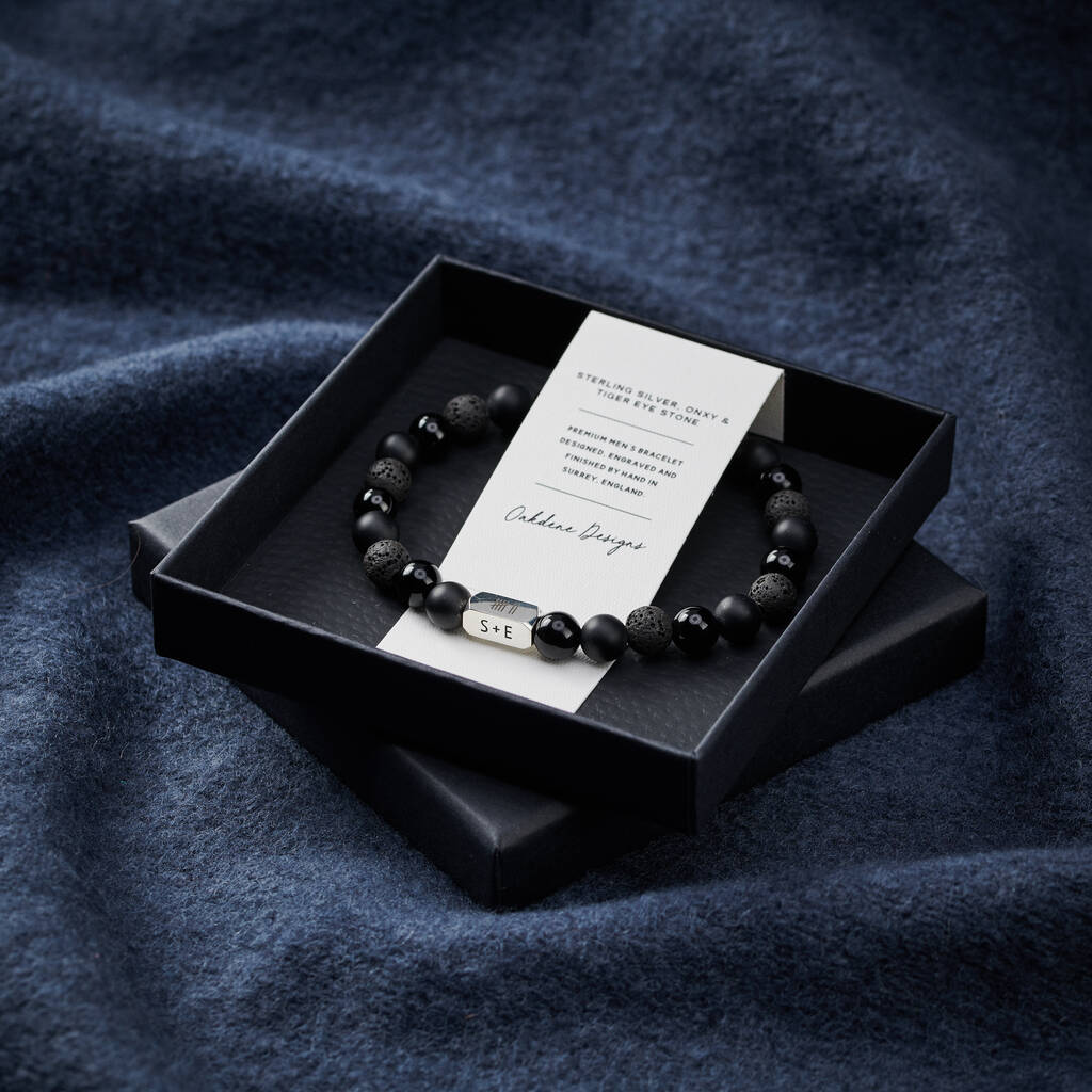 Crafted from black onyx and lava stone beads, completed with a solid sterling silver charm, offering a refined finish built to be worn and kept.