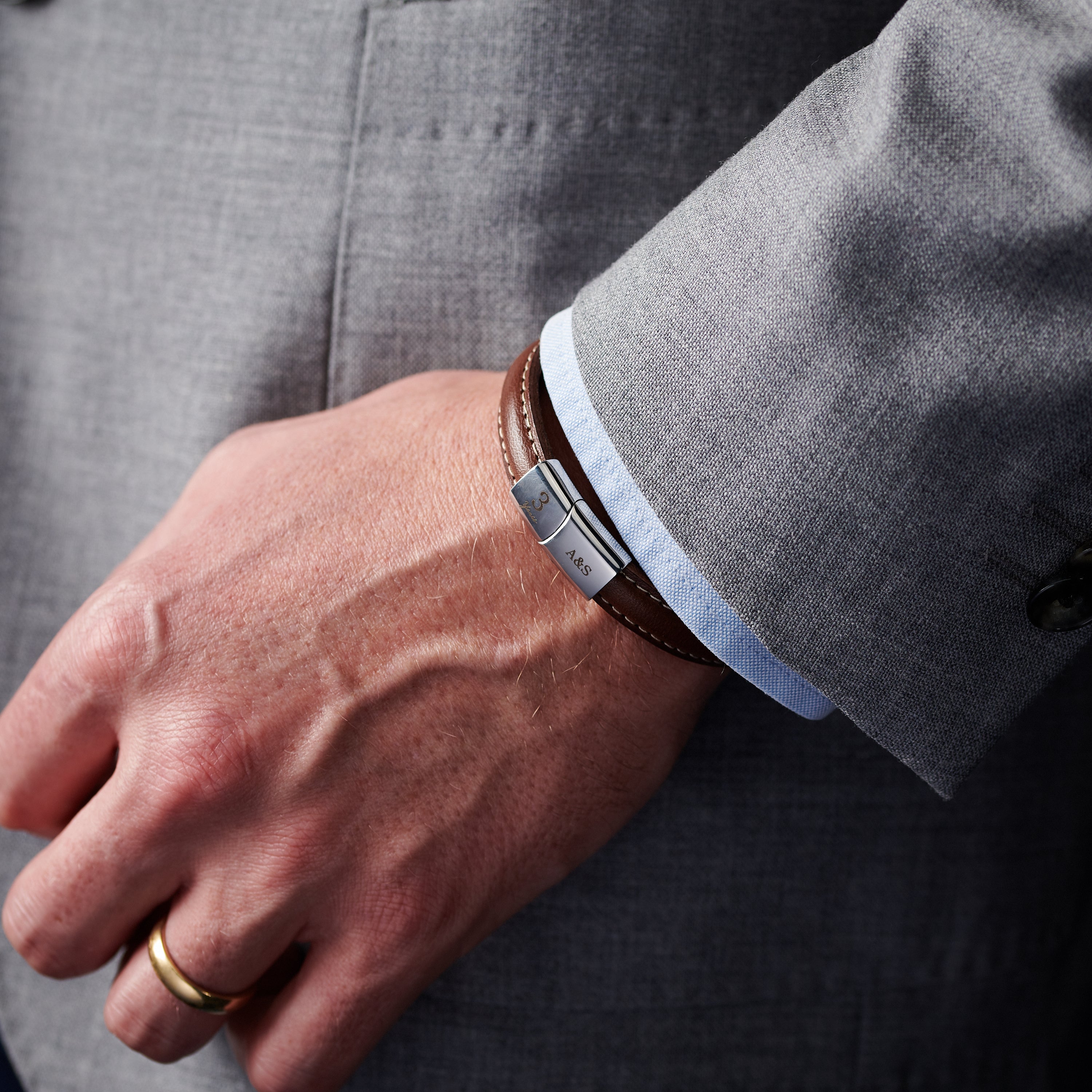 Designed to celebrate the third anniversary (traditionally the anniversary of leather) this premium men’s bracelet combines lasting materials with stylish and sentimental feel.