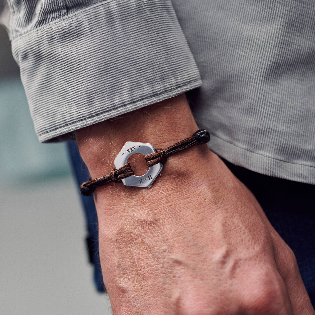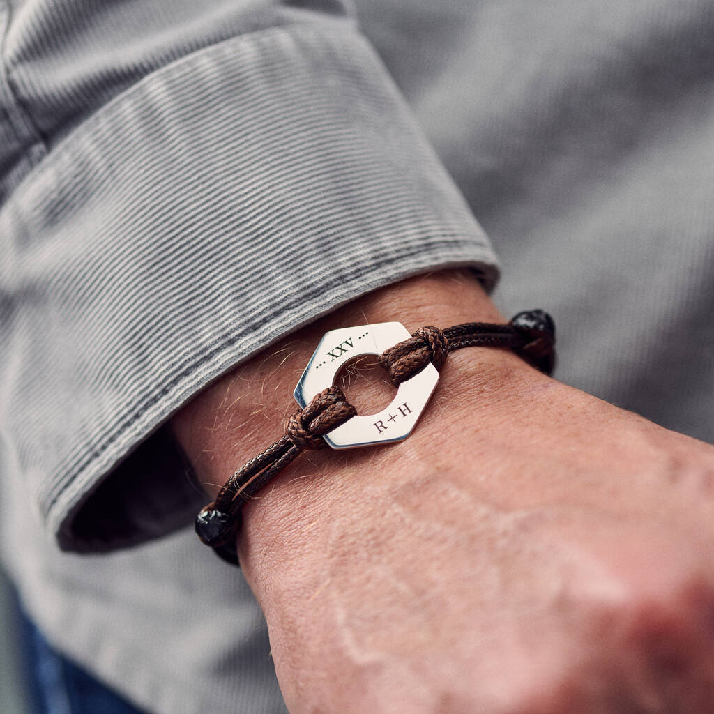 Created to celebrate a moment in time, this bracelet features a solid 925 sterling silver hexagonal charm on an adjustable cord, engraved with your anniversary in Roman numerals and personalised initials. Traditionally, silver marks the twenty-fifth anniversary, making this piece ideal for that milestone, while remaining fully customisable for any anniversary you wish to celebrate.