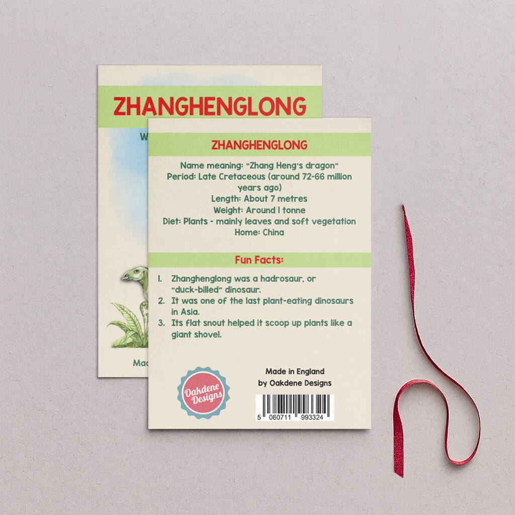 Every decoration is packaged with an A6 collectible dinosaur fact card, printed on thick card and enclosed in a clear biodegradable sleeve, giving the appearance of cellophane while remaining fully compostable.