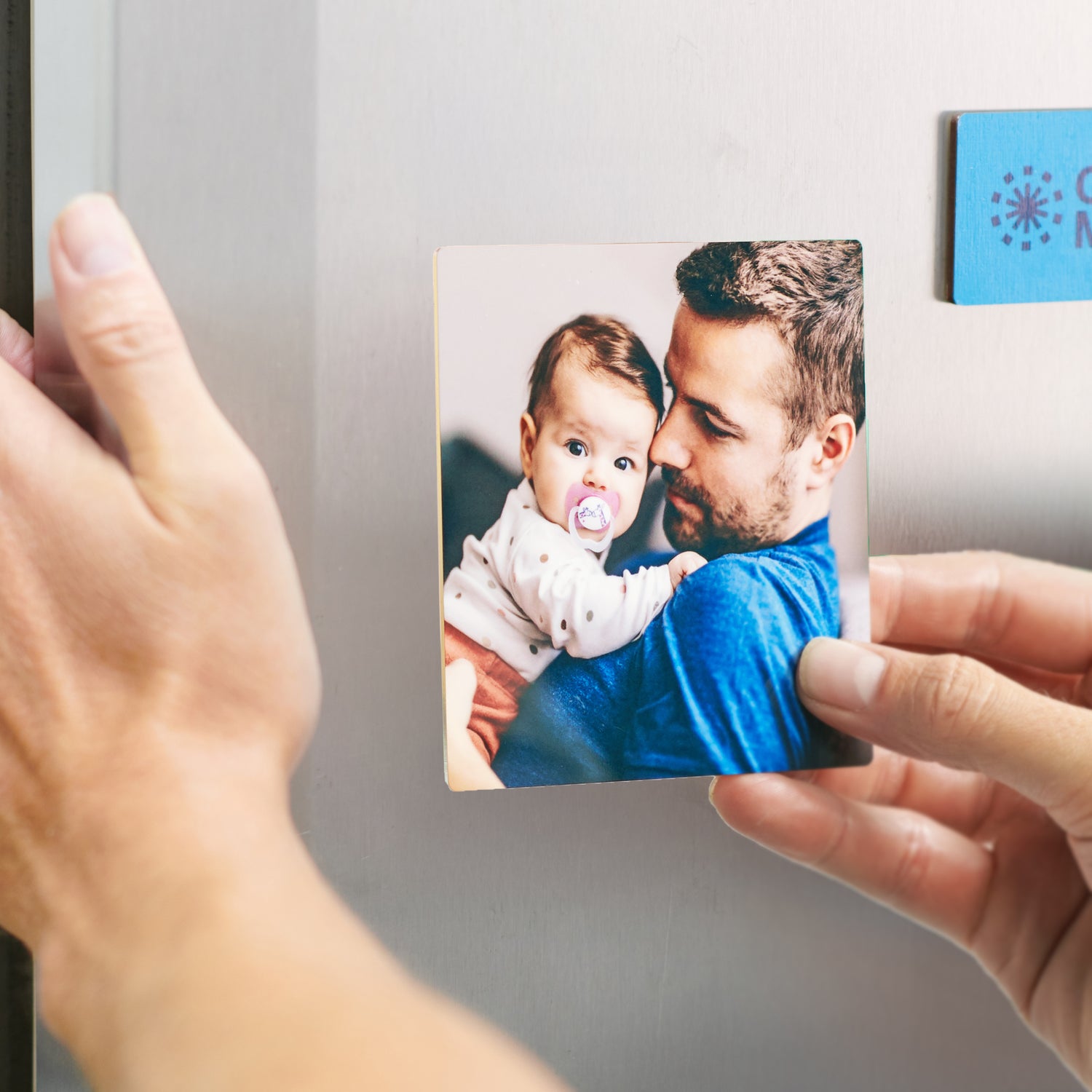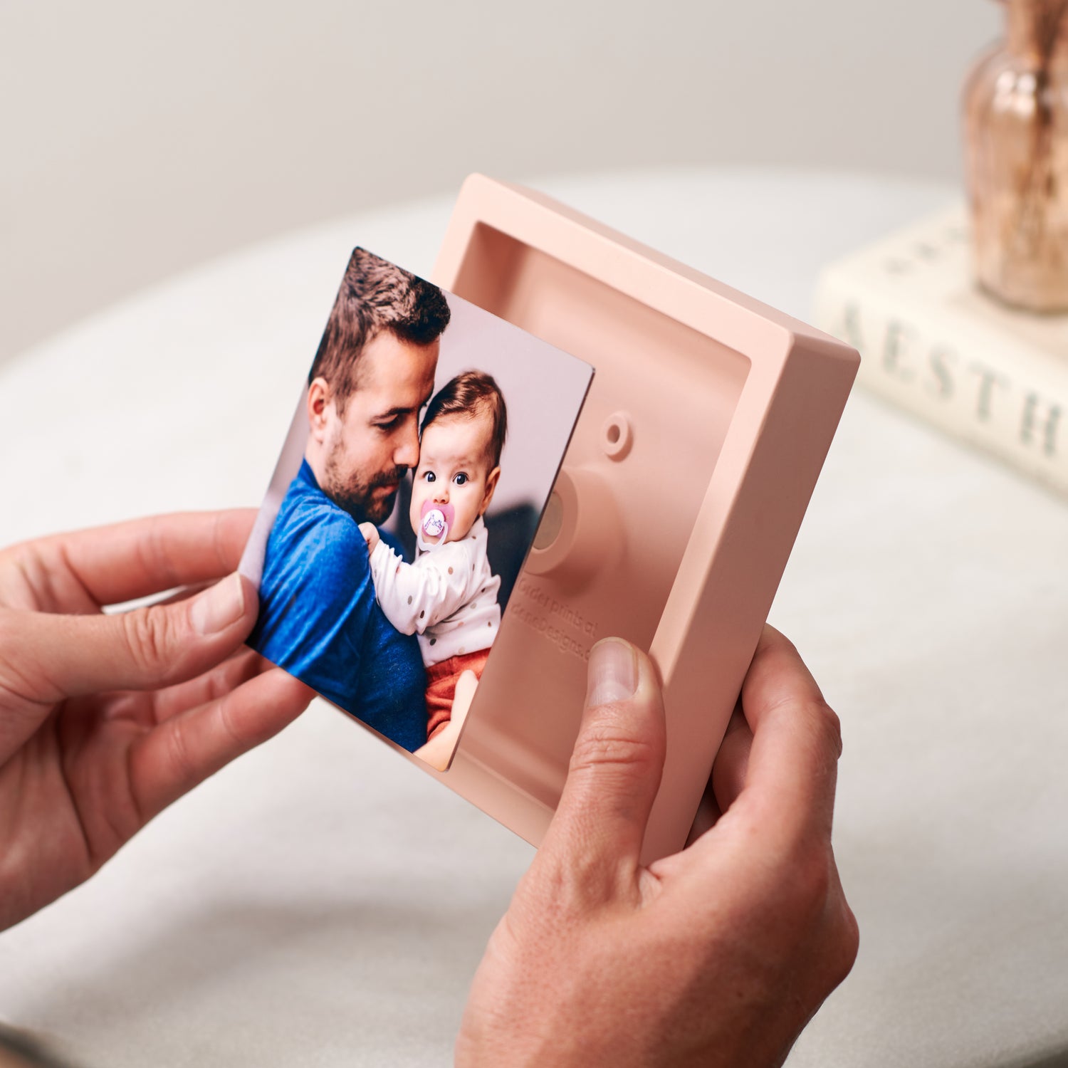 A modern photo frame where your image appears to float, printed on glossy metal and held in place by hidden magnets.
