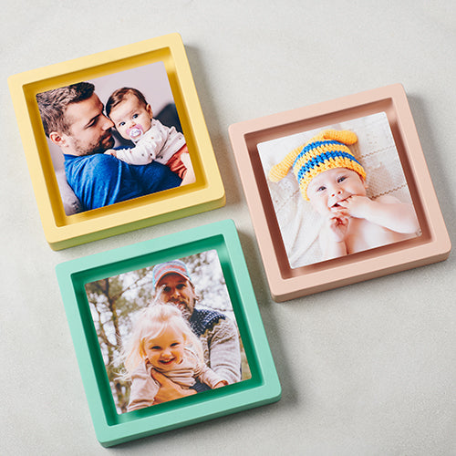 Photos can be swapped easily or used as fridge magnets. Add an optional hidden message on the back for a personal touch.