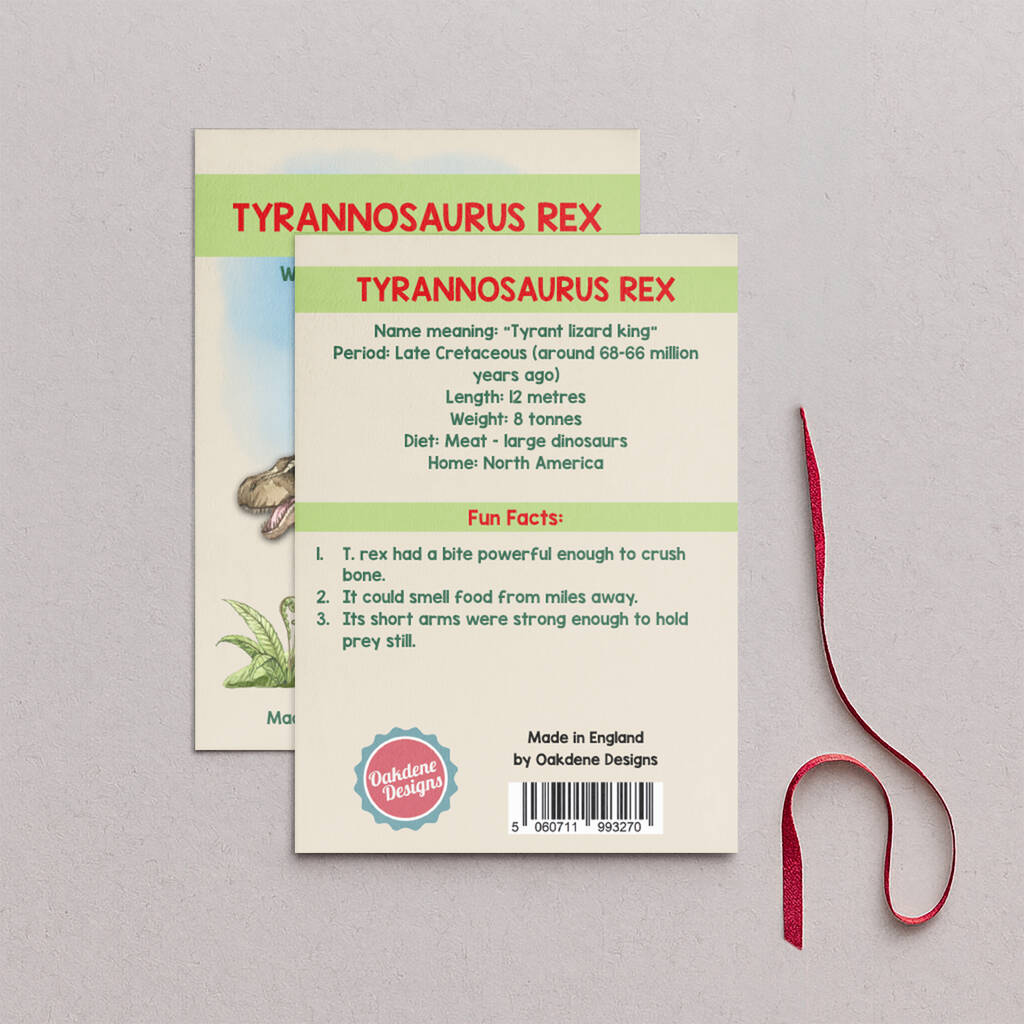 Every decoration is packaged with an A6 collectible dinosaur fact card, printed on thick card and enclosed in a clear biodegradable sleeve, giving the appearance of cellophane while remaining fully compostable.